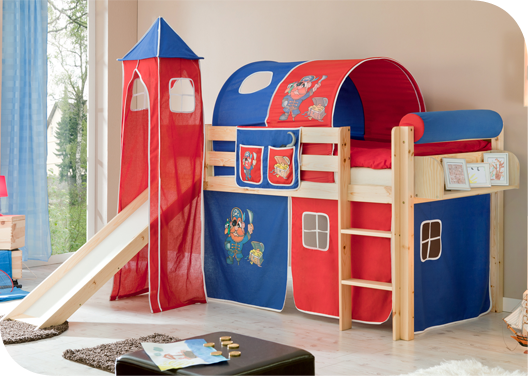 Der Traum eines jeden Kindes! In einer "Höhle" schlafen, morgens gut gelaunt herunter rutschen und unten im Versteck spielen. Der Turm verleiht dem Hochbett den Charme einer Burg und dem Besitzer leuchtende Augen. Dank verschiedener Vorhangsstoffe kann das Gesamtbild ganz nach Wunsch angepasst werden, egal ob Mädchen oder Junge.