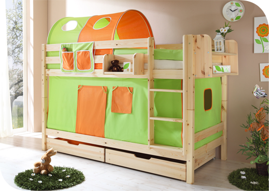 Hier gibt es keine Streiterei mehr wer oben oder unten schlafen darf! Das untere Bett schafft dank frei auswählbarem Vorhang eine "Höhlenartige" Atmosphäre, während das obere mit dem optional erhältlichen Tunnel einen gemütlichen Charakter besitzt. Die massive Bauweise, hohe Pfostenstärke und Fallschutz sorgen für die nötige Sicherheit. Dank vieler praktischer Ergänzungsprodukte kann dieses Bett auf jeden Geschmack ausgerichtet werden.