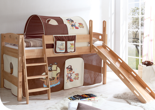 Massivholz Hochbett Rutschbett mit Schrägleiter II Buche massiv Natur Motiv "Pirat Braun-Beige"
